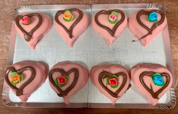 Cuori di pan di spagna ripieni Siamo alle porte di S. Valentino patron degli innamorati, allora perché non dirlo col cuore; i nostri cuoricini: soffici strati di pan di spagna inzuppati al rum, ripieni di crema e crema al cacao ricoperti da pasta di mandorle.