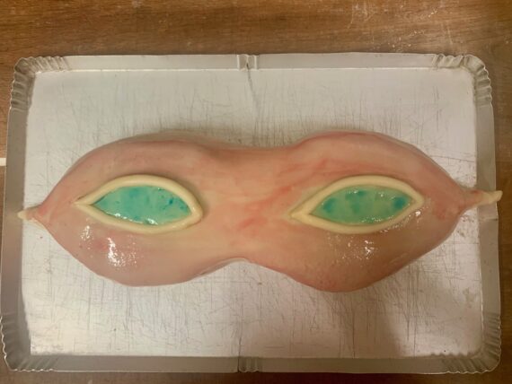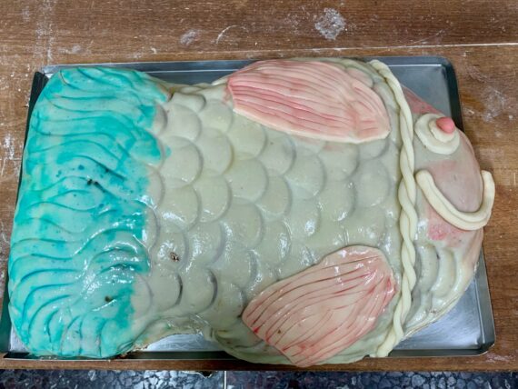 Dolce farcito alla crema Il nostro pesce d’aprile: soffice pan di spagna imbevuto al rum farcito con crema e crema al cioccolato ricoperto da uno strato di pasta alle mandorle.